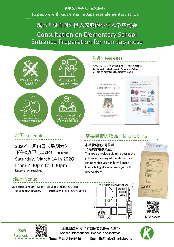 小平市国際交流協会(こだいらしこくさいこうりゅうきょうかい)(KIFA)では、小学校に入学する児童の外国人保護者向けに様々なサポートを行っています。