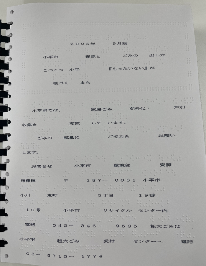 点訳版の資源とごみの収集カレンダー(2025年9月~2026年9月)、資源とごみの出し方パンフレット(2025年9月版)ができました。この資料は、点訳サークルかりん、点字の会てんとう虫の皆様が手作りで作成したものです。