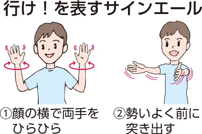顔の横で手をひらひらさせてから勢いよく前に突き出すことで、行け!を表すなど、全部で3種類を考案。