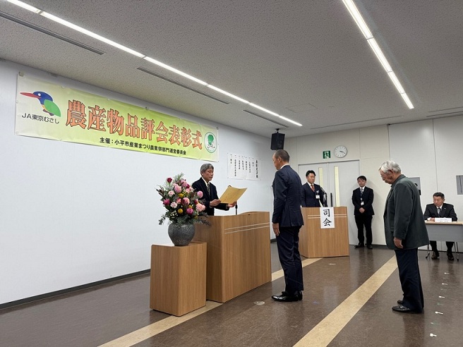 第35回小平市産業まつりで行われた、農産物品評会及び果実品評会の表彰式が小平ファーマーズ・マーケットで開催されました。生産者が丹精込めた農産物は、どれも形や色、艶など大変立派なものでした。ご受賞おめでとうございます。