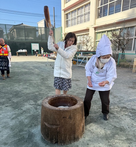 青少年対策一小地区委員会のもちつき体験会が、小平第一小学校校庭で行われました。多くの児童、保護者、地域の方々が参加され、学年ごとにもちをつき、柔らかくふんわりとしたつきたてのもちを試食しました。