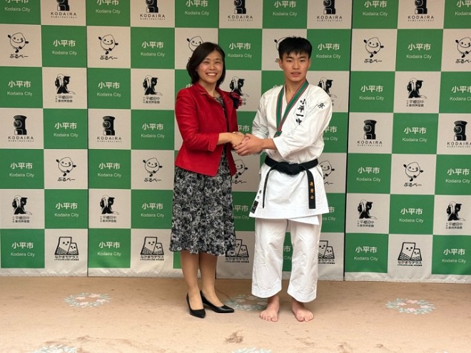 第33回全国中学生空手道選手権大会男子・個人形の部において優勝されました、小平第一中学校3年青木秀幸(あおき ひでゆき)さんに表敬訪問いただきました。本大会は全国47都道府県から代表として各2名が選出され、前年度入賞者を含む総勢100名によるトーナメント戦で行われました。今後も良い成績を残せるよう健闘をお祈りしています。