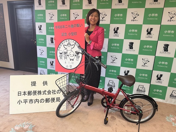 市内郵便局から、二十歳の集いで行われる抽選会の景品用として、自転車をご提供いただきました。「丸いポストのまち こだいら」の企画として、小平郵便局様に「二十歳の集い記念消印」にもご協力をいただいており、市内の郵便局の皆様方からは、毎年二十歳の集いに多大なるご支援・ご協力をいただいています。