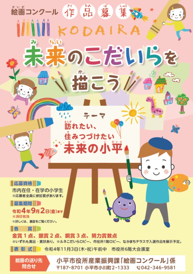 絵画コンクール募集チラシ市制施行60周年記念事業として、市内在住・在学の小学生に、「訪れたい、住みつづけたい未来の小平」をテーマに自由な発想で絵を描いてもらい、コンクールを実施しました。